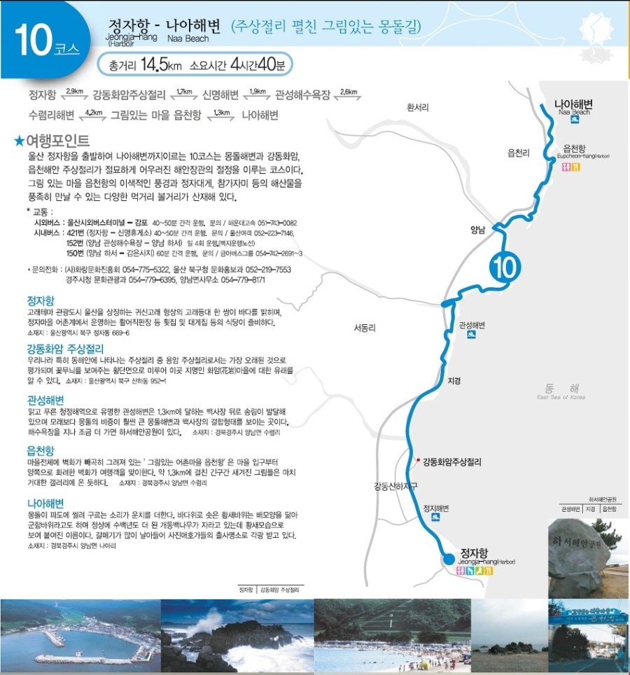 특징 : 울산의 정자항을 출발하여 강동해변과 신명해변, 경주 관성해수욕장 그리고 수렴리해변을 거쳐 나아해변까지 이르는 10코스는 지속적으로 이어지는 몽돌해변과 강동화암, 읍천해안 주상절리가 절묘하게 어우러진 해안 경관이 절정을 이루는 코스이다. 특히 양남면 하서항부터 읍천항 벽화마을까지 1.7km가량 조성된 ’양남 주상절리 파도소리길‘은 일반 주상절리와는 확연히 다른 누워있는 주상절리, 부채꼴 주상절리 등 독특한 자연자원을 만날 수 있어 그 가치가 뚜렷하며 자연이 수놓은 장관을 감상할 수 있는 최고의 여정으로 손색이 없다. 또한 ’파도소리길‘을 벗어나자마자 등장하는 ’읍천항‘은 값싸고 싱싱한 생선회를 먹기에 딱 좋다. 활어직판장에서 ’참가자미‘ 회를 떠 바닷가에서 먹는 맛은 일품이라 하겠다.