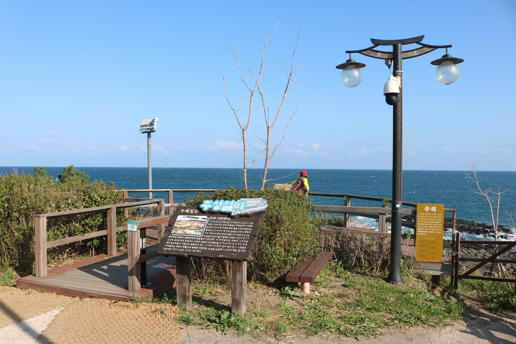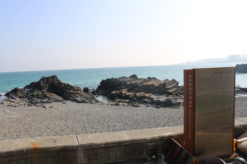 ▼ 그렇게 5분쯤 더 걷자 진행방향 저만큼에 자그만 동산 하나가 나타난다. 그 앞에 정자(亭子)를 세우고 ‘강동화암 주상절리(江東花岩 柱狀節理 : 울산광역시 기념물 제42호)’에 대해 적어놓은 안내판을 설치했다. 동해안에 나타난 주상절리 가운데 용암 주상절리로는 가장 오래된 것으로 학술적 가치가 높을 뿐만 아니라 다양한 각도로 형성되어 있어 눈요깃감으로도 훌륭하다는 내용을 적어 놓았다.