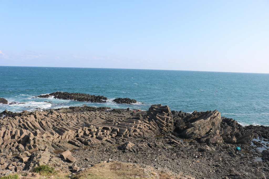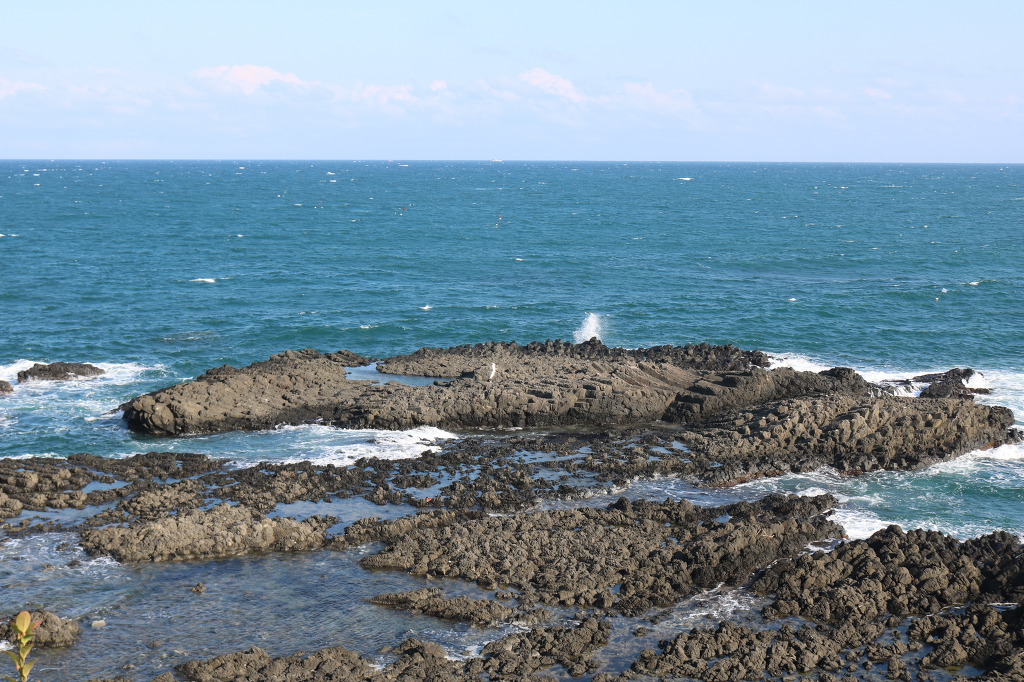 ▼ 주상절리 옆으로 나있는 탐방로는 데크(deck) 길로 조성해 걷기에 좋도록 했다. 흙길과 데크 길을 번갈아 걸으면서 갖가지 형태의 자연 예술 조각품들을 감상할 수 있을 뿐만 아니라 벤치가 곳곳에 놓여있어 사색의 공간으로도 더할 나위 없이 좋다. 아무튼 파도소리가 온몸에 가득 차오를 즈음이면 첫 번째 전망데크를 만난다. 그리고 그곳에서 ‘누워있는 주상절리(臥狀 柱狀節理, columnar joint)’와의 첫 대면이 시작된다. 길쭉한 나무들을 차곡차곡 쌓아둔 형상인데, 누워 있는 주상절리의 경우 땅이 벌어진 사이로 용암이 올라오면서 차가운 부분에서 갈라져 식어 들어가 옆으로 누운 것이란다.