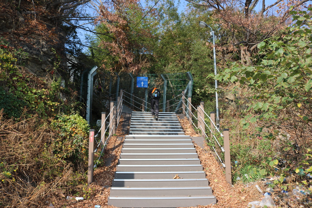 ▼ 골목으로 들어서자 계단이 나온다. 오른편에는 자전거를 끌고 올라갈 수 있도록 좁은 통로도 만들어 두었다. 조금 전에 보았던 이정표의 상단에 적혀있던 매우 급한 오르막이니 걸어가라는 안내문구가 이제야 이해가 간다. 20%의 경사로가 60m 정도 이어진단다.