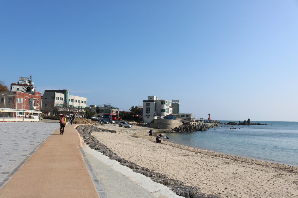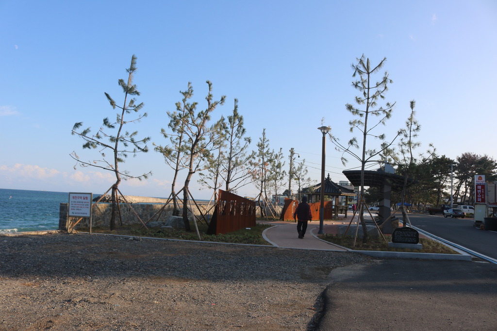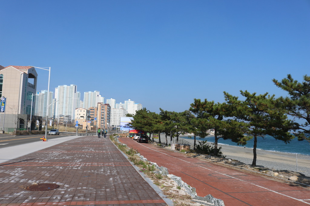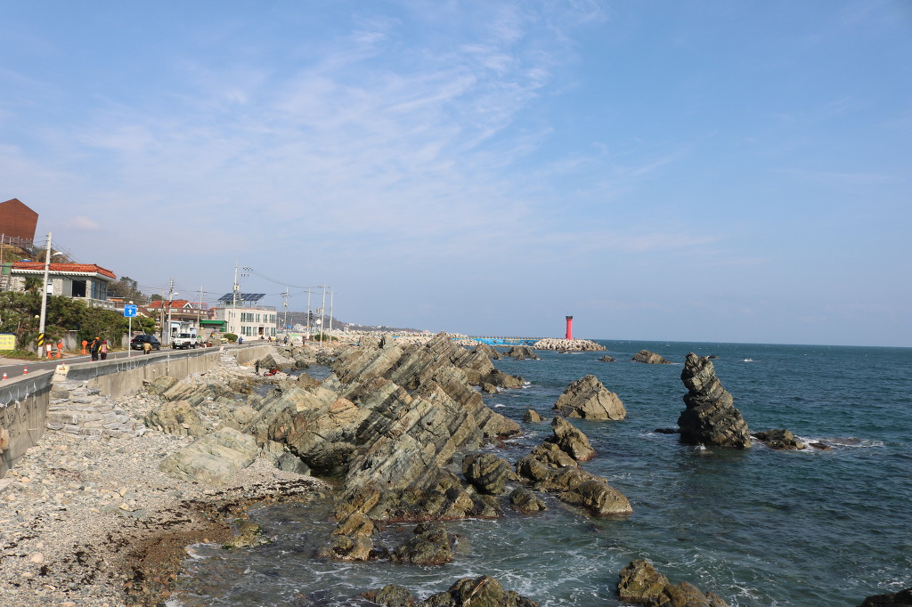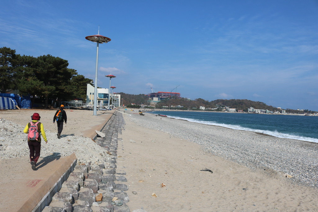 ▼ 산하천(川)을 건넌 탐방로는 이제 산하동의 해안을 따른다. 오른편은 여전히 몽돌해변이지만 왼편은 신시가지로 개발해가는 도중이어선지 조금은 어수선한 모습이다. 그렇다고 기존의 아름다운 풍광이 어디로 가겠는가. 해양수산부에서 '아름다운 어촌 100선'에 아무 이유도 없이 이곳 정자마을을 뽑지는 않았을 것이다. 거기에다 2011년에는 한국관광공사에서 ‘3월의 가볼만한 곳’에 이곳을 선정했으니 이들이 증인인 셈이다.