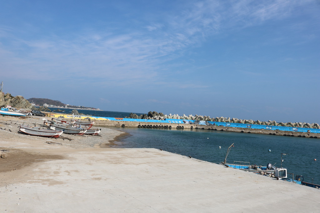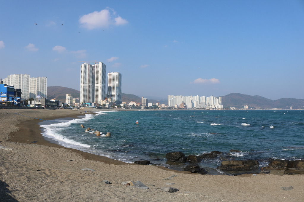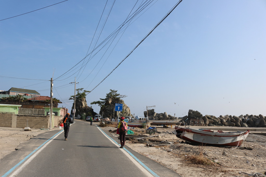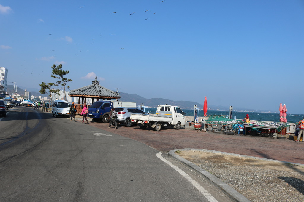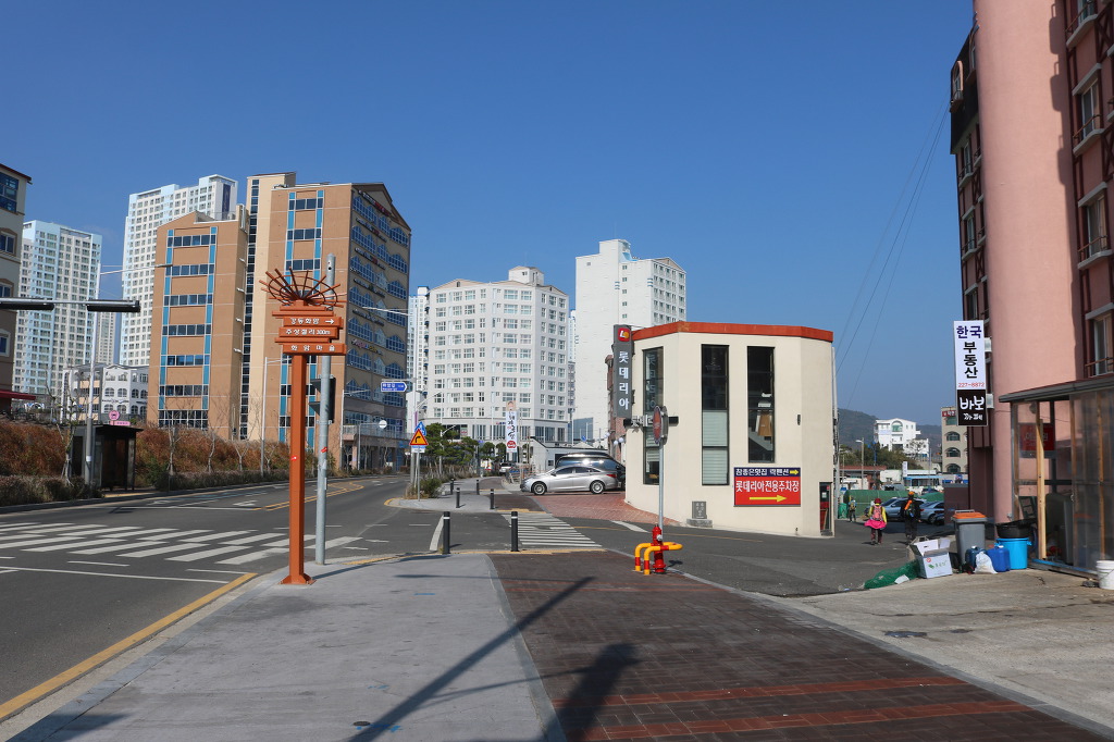▼ 산하천(川)을 건넌 탐방로는 이제 산하동의 해안을 따른다. 오른편은 여전히 몽돌해변이지만 왼편은 신시가지로 개발해가는 도중이어선지 조금은 어수선한 모습이다. 그렇다고 기존의 아름다운 풍광이 어디로 가겠는가. 해양수산부에서 '아름다운 어촌 100선'에 아무 이유도 없이 이곳 정자마을을 뽑지는 않았을 것이다. 거기에다 2011년에는 한국관광공사에서 ‘3월의 가볼만한 곳’에 이곳을 선정했으니 이들이 증인인 셈이다.