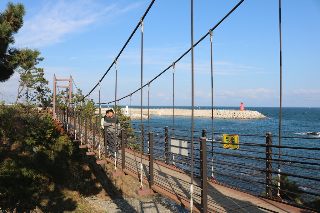 ▼ 잠시 후 출렁다리가 나온다. 지난 2012년에 만든 폭 1.5m, 길이 32m의 현수식 출렁다리인데 이 다리를 빠져나오면 주상절리 관광은 끝난다. 그렇다고 주위 경관까지 끝났다는 얘기는 아니다. 진행방향 저만큼에 읍천항이 나타나면서 새로운 경관이 시작되기 때문이다.
