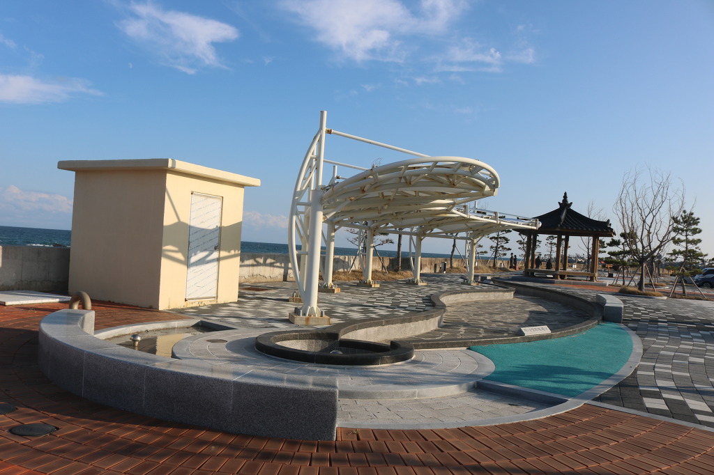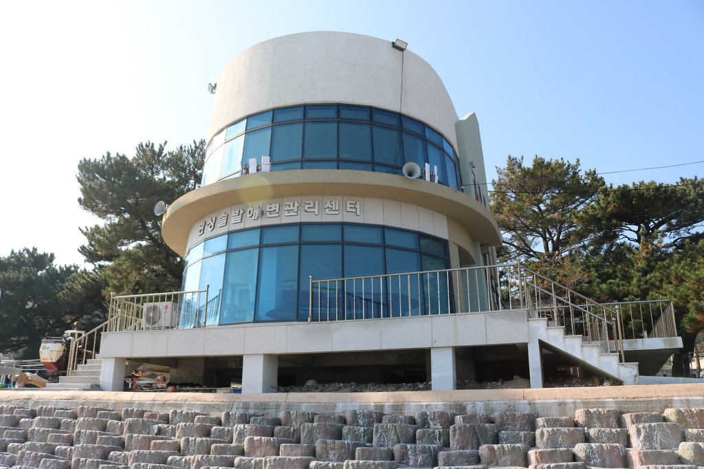 ▼ 카메라에 잡히지는 않았지만 관리센터 옆에는 첨성대(瞻星臺) 모양의 조형물이 세워져 있다. ‘관성(觀星)이라는 마을 이름에 얽힌 사연을 전해주고 싶었던 모양이다. 신라 시대에 별을 관측해 시간을 측정하는 첨성대 같은 시설이 있었던 마을이라는 것이다. 거기다 해변에 솔밭이 있다고 해서 ’솔밭‘이라는 낱말을 하나 더 붙여 ’관성솔밭해변‘이 되었다.