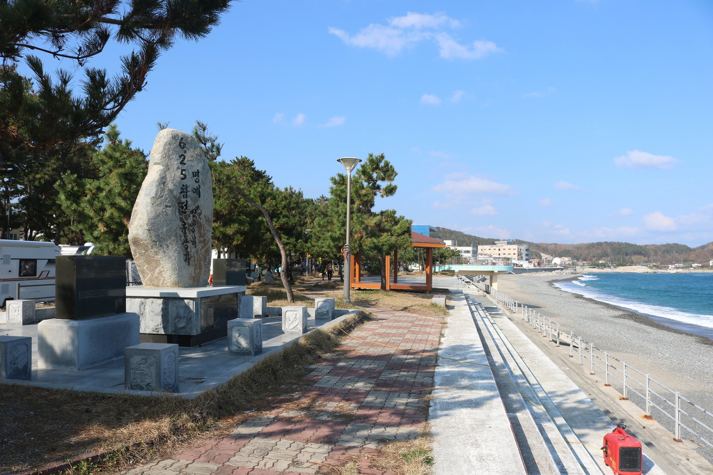 ▼ 그렇게 잠시 걷자 하서해안에 이른다. 몽돌해변으로 여름에 해수욕을 즐기기에 안성맞춤일 뿐만 아니라, 해수욕장 뒤쪽으로 소나무 숲이 우거져 있어 시원한 그늘 아래에서 바닷바람을 만끽할 수도 있다. 과연 ‘아는 사람만 아는 숨겨진 고즈넉한 바닷가’라는 입소문에 어울리는 곳이라 할 수 있겠다. 아무튼 2005년에 조성되었다는 해안공원에는 ‘6·25참전 유공자 명예 선양비’가 세워져 있다. 이 지역 출신으로 6·25전쟁에 참전한 유공자를 기리기 위해 2005년에 세웠는데, 가운데 자연석으로 된 비석을 세우고 양쪽에 설치한 까만 비석에는 500여명의 참전용사와 월남전에 참가한 파월장병의 명단이 새겨져 있다. 그밖에도 전망대와 파고라. 캠핑장, 평상, 식수대 등 각종 편의시설을 갖추고 있어 여름철 피서지로는 이만한 곳도 드물겠다.