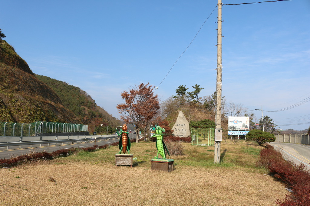 ▼ 잠시 후 탐방로는 다시 국도와 헤어져 오른편 수렴리로 들어가는 이차선 도로를 따른다. 이곳에 ’경상북도 경주시 양남면‘이라고 적힌 커다란 표지석이 세워져 있다. 그 앞에 조성된 작은 공원에는 배짱이 조형물을 배치했다. 암수 한 쌍인 모양인데 한 마리는 바이올린을 연주하고, 다른 한 마리는 피리를 불고 있다.