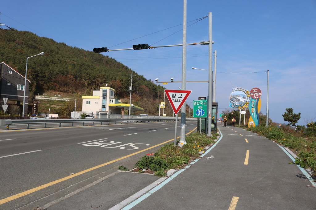 ▼ 계단을 올라서면 국도 31호선을 만난다. 도로변에 5㎞ 전방에 주상절리가 있다는 것을 알려주는 안내판이 우리가 길을 제대로 들어왔음을 증명해주고 있다. 참! 국도로 올라왔으니 해파랑길 찾기에 대해 거론해 보자. 길을 찾는 일은 그다지 어렵지 않다. 전신주 등 주변의 시설물들에 ’해파랑길‘의 방향표시가 되어있기 때문이다. 그래도 마음이 놓이지 않는다면 이것 하나만 기억해 두면 될 일이다. 국도를 따라 걷다가도 해변으로 길이 연결될 경우에는 서슴없이 내려가라는 얘기이다. 틀림없이 해파랑길 표식을 찾을 수 있을 것이다.