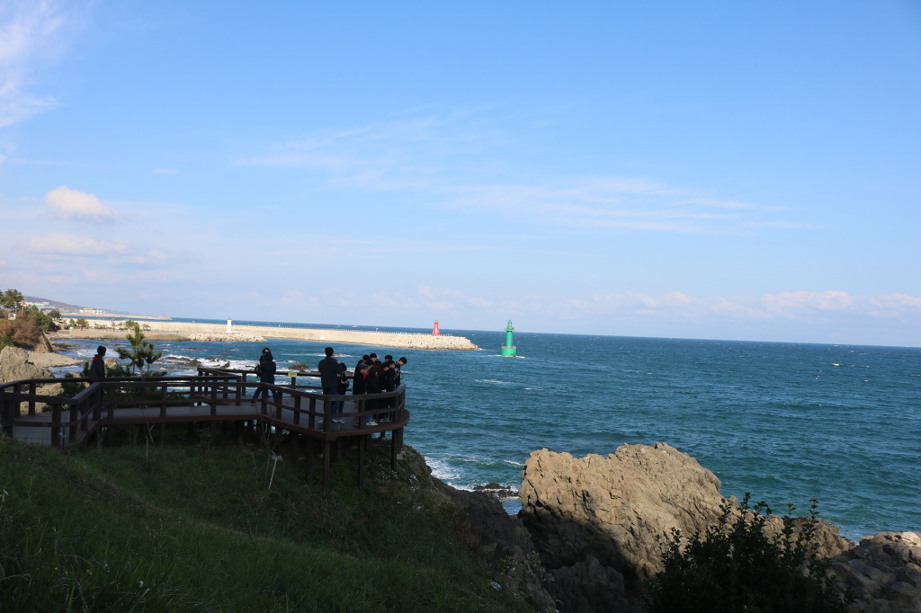 ▼ 신명항을 지나자 바다에 들어앉은 바위들의 숫자가 부쩍 늘어난다. 그 생김새 하나하나가 범상치 않은 게 하나도 없는 바위들이다. 덕분에 바다는 한 굽이를 돌 때마다 품고 있는 또 다른 속살들을 아낌없이 보여준다. 그리고 그 끄트머리에서 땅이 경계를 이룬다는 ’지경마을(地境里)‘을 만난다. 행정구역이 울산시(북구)와 경상북도(경주시)가 경계를 이룬다고 해서 그런 이름이 붙여졌단다. 마을 앞에는 작은 배들이 드나들 수 있도록 항구가 만들어져 있다. 아무튼 경주 지역에 들어서자 길 찾기가 한결 수월해진다. 종합안내판과 이정표는 물론이고 간이안내체계(나무패널, 고리형패널, 리본, 바닥페인팅)까지 잘 구축되어 있기 때문이다. 편의점과 화장실 등 편의시설들도 심심찮게 만난다.