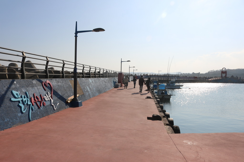 ▼ 하서4리에는 ‘주상절리’란 이름의 대형 주차장이 조성되어 있다. ‘파도소리 주상절리길’ 안내도까지 세워놓을 걸 보면 이곳에 차를 세워놓고 주상절리를 구경하라는 모양이다. 그러나 탐방로는 ‘하서리’를 아직까지 벗어나지 못하고 있나 보다. 하서항(율로진리항)의 오른편으로 길게 늘어선 방파제 끝에 만들어놓은 ‘사랑의 열쇠’가 눈에 들어오는 걸 보면 말이다. 방파제에는 ‘사랑이 이루어지는 바다’라는 뜻의 ‘사랑海’를 테마(Thema)로 젊은 연인들의 프로포즈 장소와 포토존까지 만들어 놓았다. 참고로 이곳 하서항(율포항)은 신라시대 때의 재상인 박재상이 내물왕의 왕자인 ‘미사흔’을 구하기 위해 왜국으로 출발했던 장소이다. 사랑의 자물쇠는 부부의 애틋한 사랑과 재회를 기념하는 의미에서 세웠다고 한다. 억겁의 세월이 지나서도 변하지 않고 있는 박재상과 그의 아내를 모티브로 삼은 모양이다. 하서해안공원에서 이곳 하서항까지는 15분이 걸렸다.