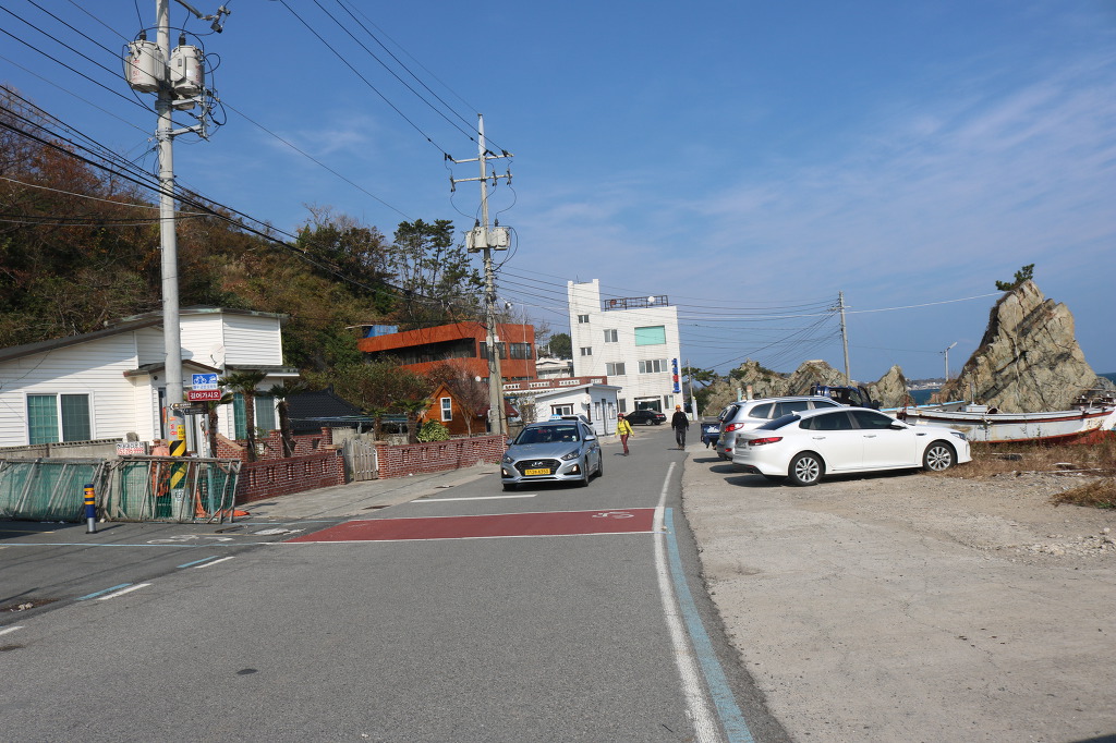 ▼ 한참을 앞서가던 집사람이 되돌아오는 게 보인다. 항구의 끄트머리에서 길이 막혀있다는 것이다. 맞다. 해파랑길은 항구가 끝나기 전에 왼편으로 열린다. 갑자기 길이 나뉘어 당황스러울 수도 있겠으나 들머리에 이정표(관성해수욕장← 1.4㎞/ 강동화암 주상절리↓ 2.6㎞)를 세워놓았을 뿐만 아니라 전신주 등에 ’해파랑길‘의 진행방향 표식이 너절하다 싶을 정도로 잘 붙여져 있으니 조금만 주의를 기울인다면 어렵지 않게 찾을 수 있을 것이다. 아니 계속해서 함께하고 있는 ’자전거길‘을 따른다고 생각하면 더 쉬울 수도 있겠다. 길바닥에 자전거표시가 확실하게 그려져 있기 때문이다.