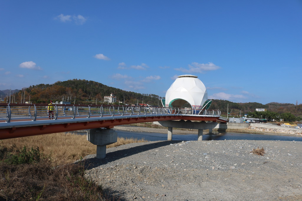 ▼ 하서마을을 관통하는 ‘하서천(川)’을 가로지르는 다리가 ‘하서교(橋)’이다. 해파랑길 지도에는 이 다리를 건너도록 되어 있다. 하지만 지금은 그럴 필요가 없다. '물빛사랑교'라는 보행자 전용의 다리를 새로 놓았기 때문이다. 생김새만 놓고 보아도 예쁜데 거리까지 400m를 단축시켰으니 고마운 일이라 하겠다. 다리의 중간에 만들어 놓은 돔 모양의 쉼터에는 ‘물빛 사랑교’라는 이름이 붙게 된 연유가 적혀있다. 예로부터 인근 마을 처녀 총각들이 달빛 어린 하서천 물빛을 바라보며 물속에 잠겨 있는 수많은 별을 헤아리며 사랑을 속삭였다는 데서 착안했다고 한다.