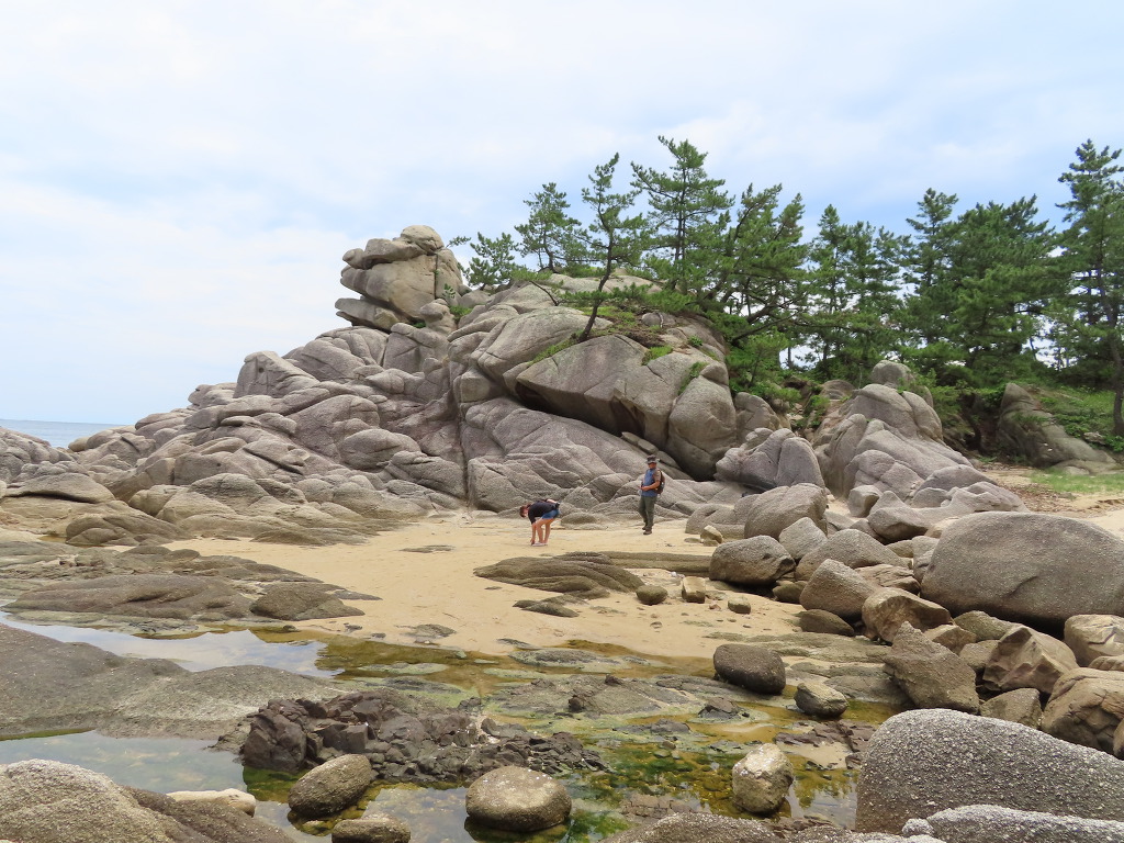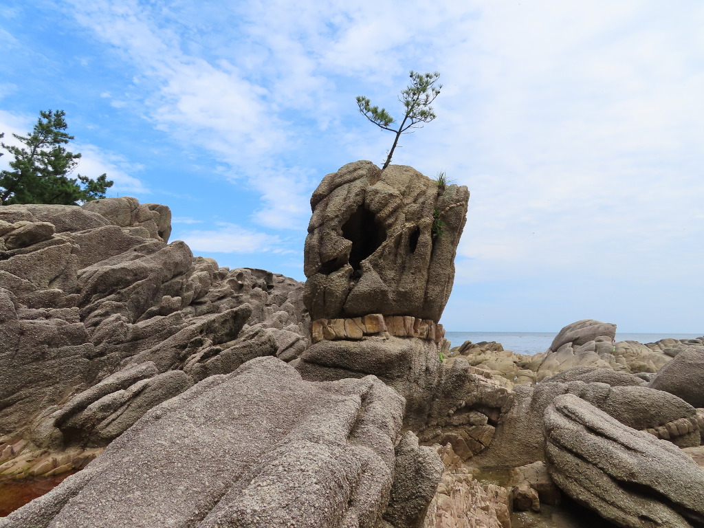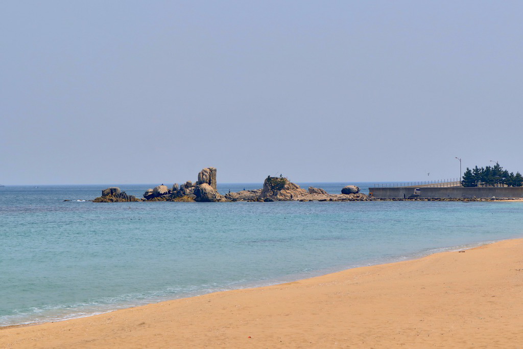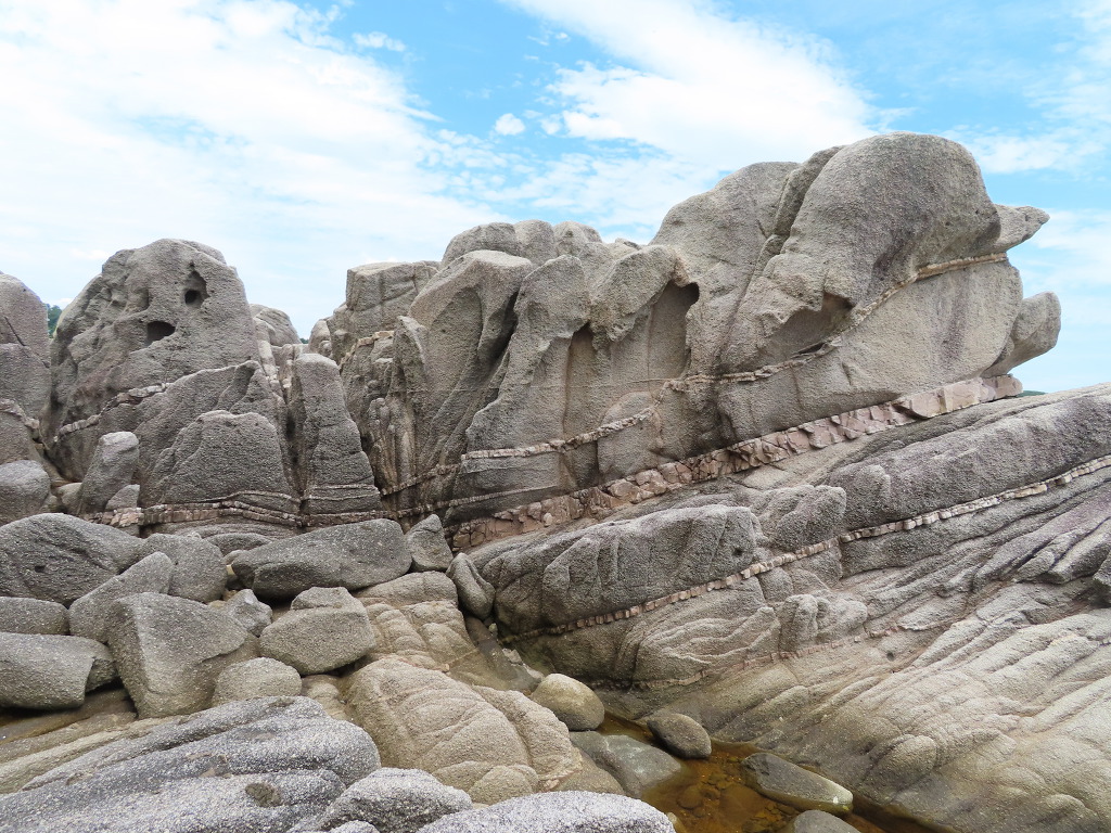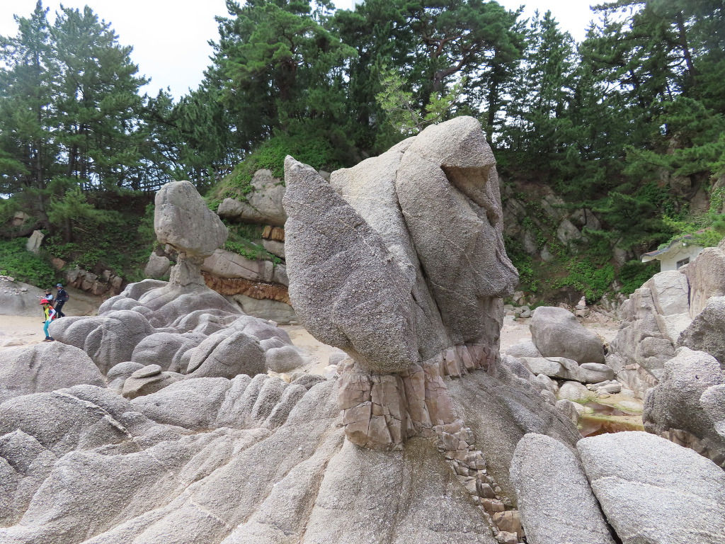 ▼ 국가지질공원인 이곳은 화강암의 풍화미지형(風化微地形)과 파도의 침식작용이 어우러져 매우 독특한 지형경관을 이루고 있다. 거대한 화강암 덩어리 속으로 마그마가 뚫고 들어와 형성된 암맥(岩脈, dike rock)이 겉으로 드러나 보이는 독특한 형태로, 회백색의 화강암 사이로 관입해 식어버린 돌은 옅은 갈색의 규장암이다. 8300만 년 전에 생성되었다는 규장암층은 뱀 꼬리처럼 바닷가 백사장까지 길게 이어져 있는데 멀리서 보면 커다란 햄버거나 샌드위치처럼 보이기도 한다.