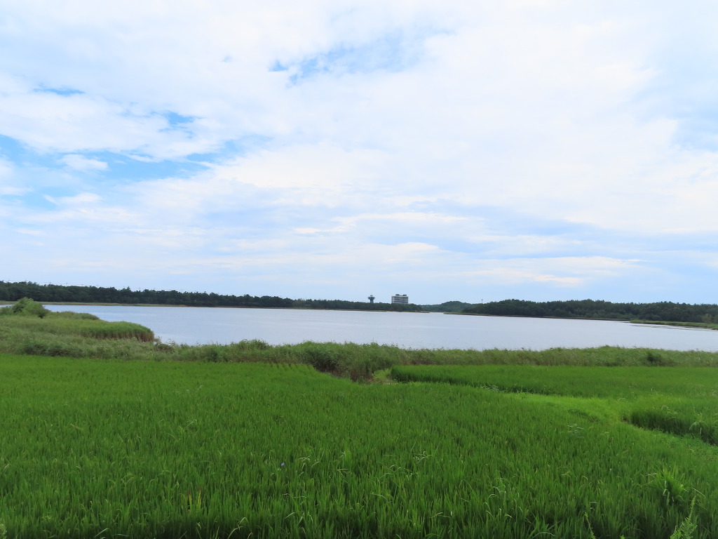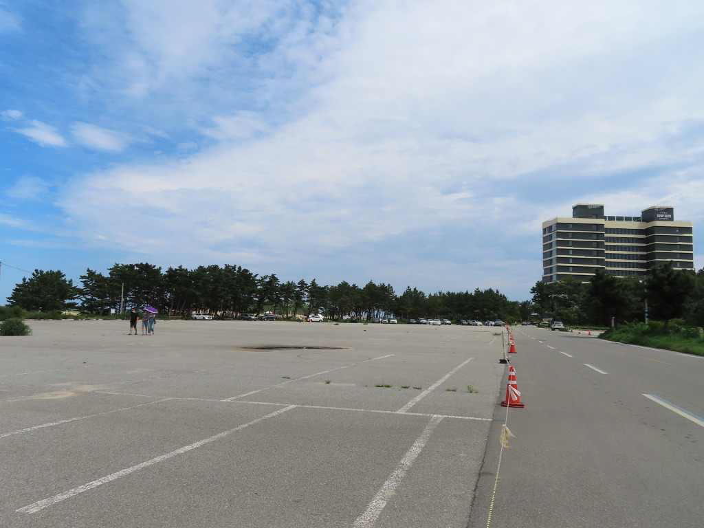 ▼ 송지호 모래사장이 끝나는 곳에는 최근에 오픈한 '르네블루by워커힐(하얀색 건물)'이 들어서 있었다. 87개의 럭셔리 객실을 비롯해 루프톱(Rooftop), 비즈니스센터, 스몰 웨딩이 가능한 연회장 등 다양한 부대시설을 갖추었단다. 이어서 주차장이 나오는데 이게 거짓말 좀 보태서 북경의 천안문광장 만큼이나 넓다. 하지만 텅텅 비어있다. 수요 예측을 잘못 했는지 아니면 ‘코로나19’의 영향으로 피서객들의 숫자가 현격히 줄었는지는 모르겠다.