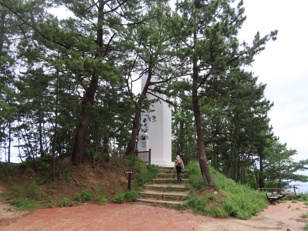 ▼ 통나무계단을 올라서자 하얀색 등대가 길손을 맞는다. 등대 부근에 산재해 있는 암초들로부터 선박을 보호하기 위해 세운 등대라는데 맞는지는 모르겠다. 아무튼 크기나 생김새, 어느 것 하나 내세울 게 없는 그저 그렇고 그런 등대이다. 탐방로는 등대의 옆을 스치듯 지나간다.