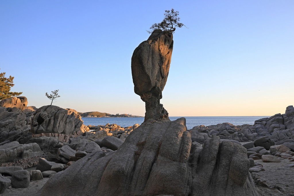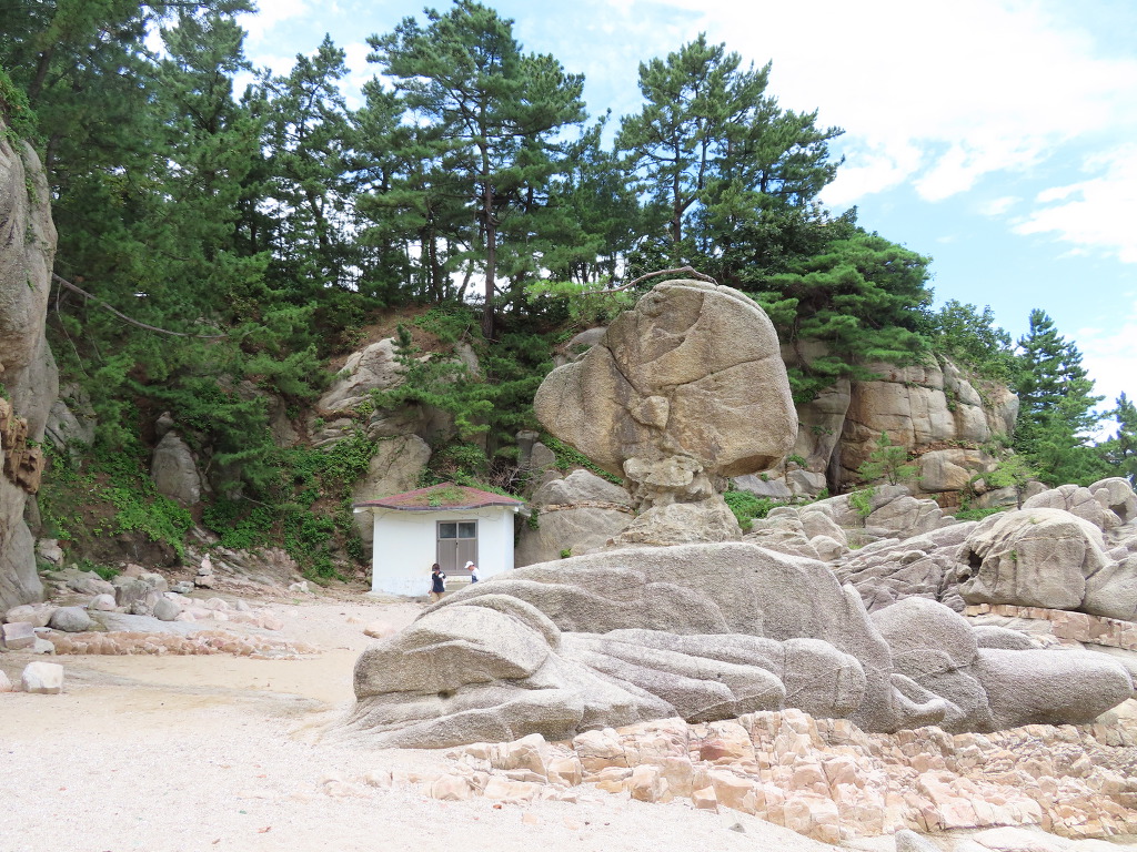 ▼ 서낭당의 오른편에 보이는 ‘부채바위’는 버섯이나 오리, 문어 등 바라보는 각도에 따라 그 형태가 달라진다. 차별침식으로 머리 부분이 넓적하고 허리 부분이 잘록하게 깎인 바위인데, 쓰러질 듯 아슬아슬한 것이 여간 위태롭지가 않다. 그래선지 목 부위에 시멘트로 보강한 흔적도 보였다. 참! 그러고 보니 대만에서도 저렇게 생긴 바위를 본적이 있다. 세계자연유산인 ‘야류지질공원’의 명물 ‘여왕머리 바위(女王頭)’로 당시 가이드는 고대 이집트의 여왕 ‘네페르티티(Nefertiti, BC1370-1330)’를 닮았다고 했다. 당시 우리 부부는 그녀와 함께 사진 한번 찍어보려고 언제 줄어들지도 모르는 줄을 하염없이 서있어야만 했는데 ‘부채바위’ 앞은 썰렁하기만 하다. 머리 위에 소나무까지 이고 있는 게 대만보다 오히려 한 수 위인데도 말이다. 아직까지 입소문을 타지 않았다는 얘기일 것이다. 스토리텔링이라도 가미될 경우 관람료까지 너끈히 받을 수 있을 텐데 아쉬운 일이라 하겠다.