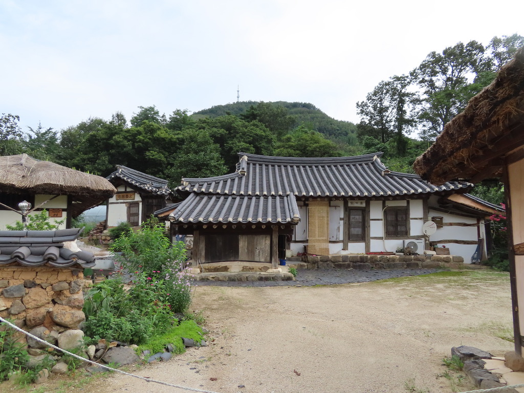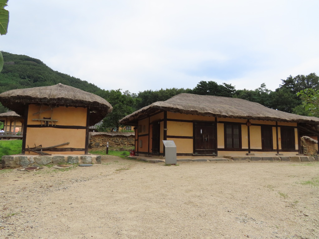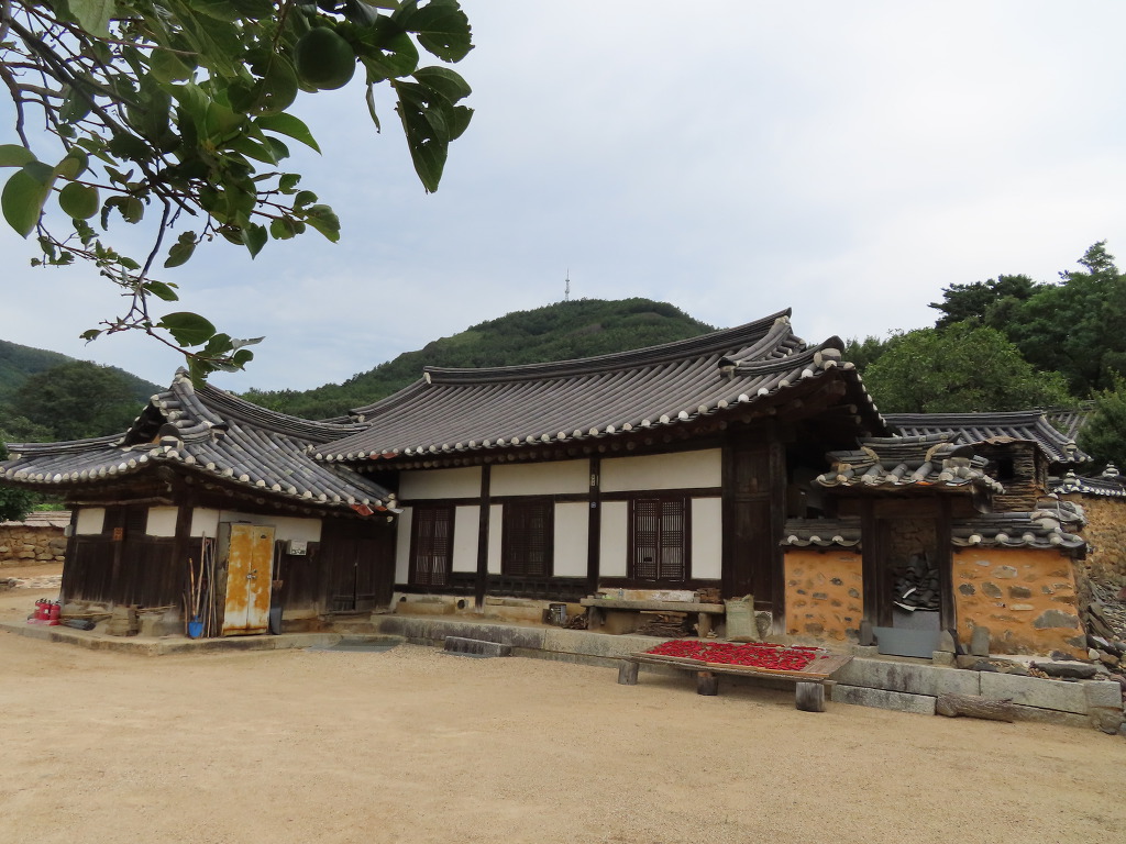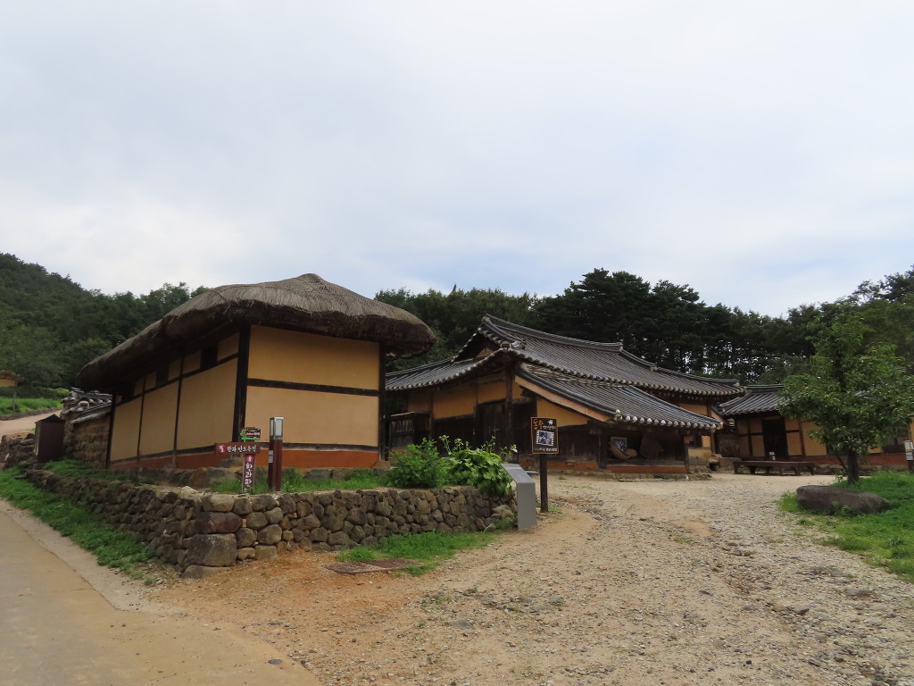 ▼ 이젠 전통가옥들을 둘러볼 차례이다. 마을은 50여 가구가 산자락에 기대어 옹기종기 모여 있다. 기와집(31채)과 초가집(20채)이 적절히 섞여 있는데다 전선을 지중화한 덕분에 전봇대도 보이지 않는다. 갑자기 근대 이전의 조선시대로 돌아간 느낌이 드는 이유이다. 첫 번째로 안내판이 없는 기와집을 둘러봤다. 'ㄱ' 자형으로 부엌에 외양간을 붙었다. 눈이 많이 내리는 것에 대비하여 기와지붕은 경사지게 하였고 집의 기단도 돌을 쌓아 높였다. 차가운 북서풍을 막으려고 집 뒤는 담으로 막았으나 햇볕 드는 앞쪽은 틔웠다. 이러한 형태를 조선 시대 함경도 지방(관북지방) 겹집 구조라고 한단다. 굴뚝도 눈길을 끈다. 진흙과 기와를 켜켜이 쌓아 지붕만큼 올리고 위에 항아리를 거꾸로 놓았다. 열기를 구들로 다시 들여보내기 위한 지혜란다.