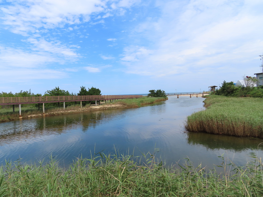 ▼ 강원심층수의 울타리가 끝나면 송지호에서 흘러나오는 물길과 동해바다가 만나는 기수역(汽水域)이 나온다. 탐방로는 이곳(이정표 : 송지호↑/ 오토캠핑장→)에서 둘로 나뉜다. 해파랑길은 송지호가 있는 왼쪽, 송지호 해변의 또 다른 명물인 ‘오토캠핑장’으로 가고 싶다면 물길 위에 놓은 목교(木橋)를 건너면 된다. 90개소의 야영장(데크)과 10동의 통나무집으로 구성된 오토캠핑장은 지난 2007년 개장 이래 매년 많은 캠핑족이 찾는다고 한다. 탁 트인 동해바다와 널찍한 모래사장, 그리고 울창한 송림이 우거진 송지호(호수)가 자랑거리인데, 최근 밀리터리체험장까지 들어서면서 가족단위 캠핑족들로부터 각광을 받고 있단다.