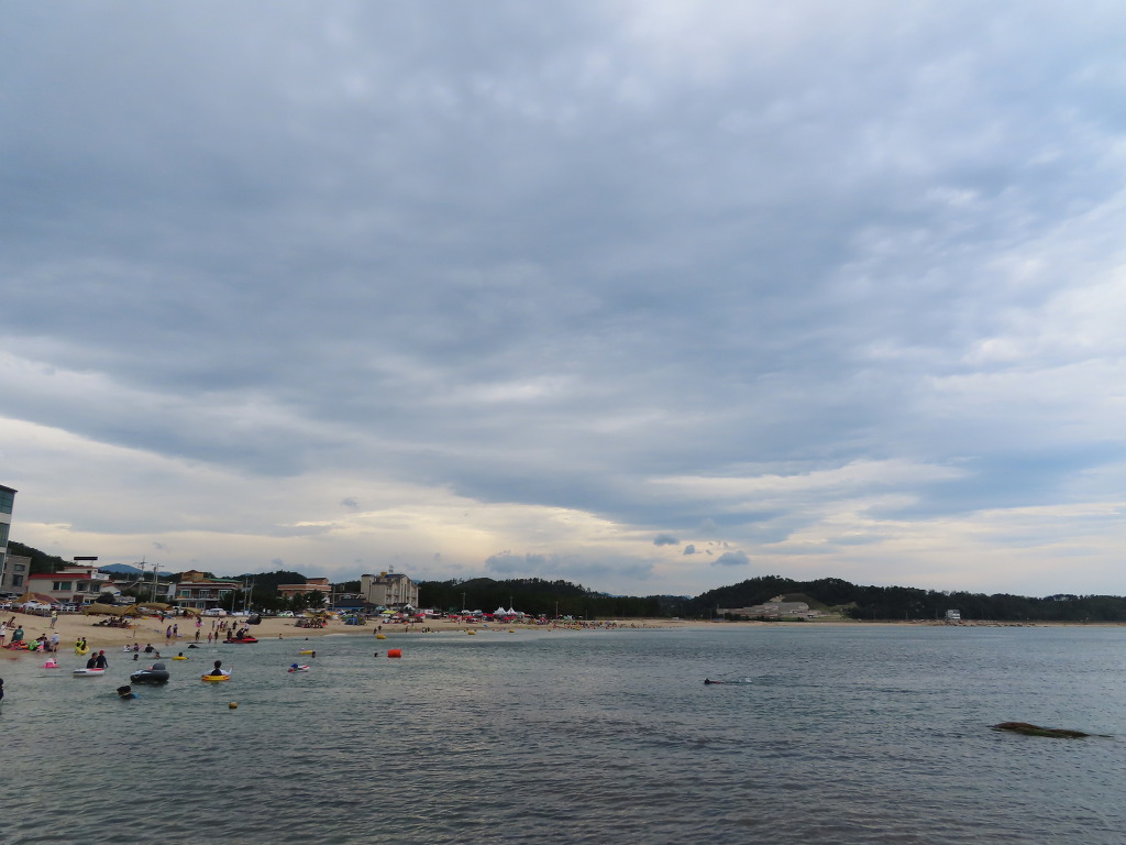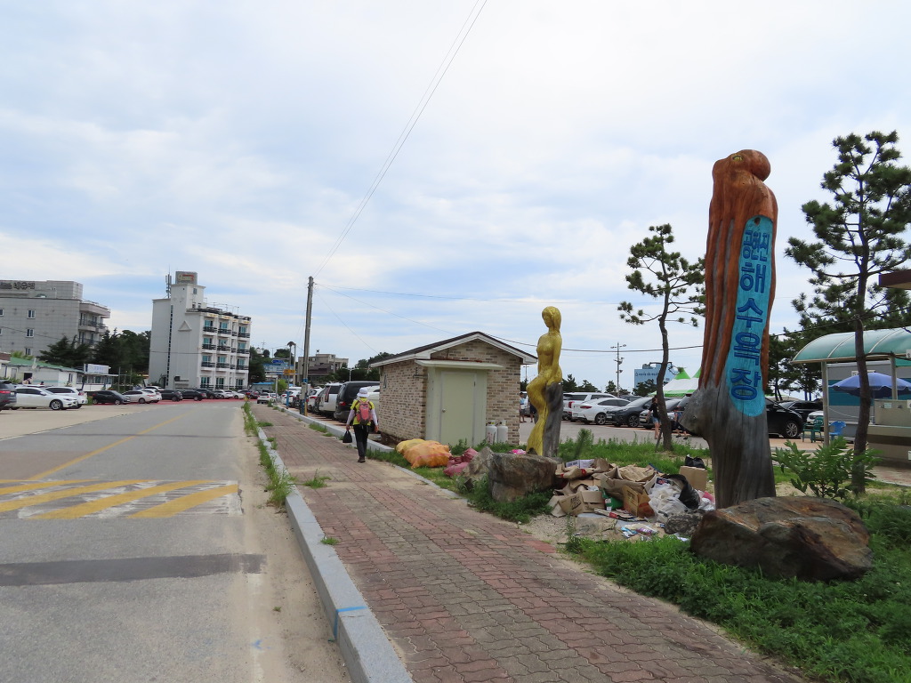 ▼ 15분 정도 눈요기를 즐기다가 '서낭바위 산책로' 입구(이정표 : 송지호해변 0.4㎞/ 오호항 0.1㎞)로 되돌아 나와 이번에는 ‘송지호 해변’으로 향한다. 아니 송지호 해변이 이미 시작되었다는 게 옳은 표현이겠다. 해안도로(심층수길)의 오른편 백사장에 피서객들로 가득하니 말이다.
