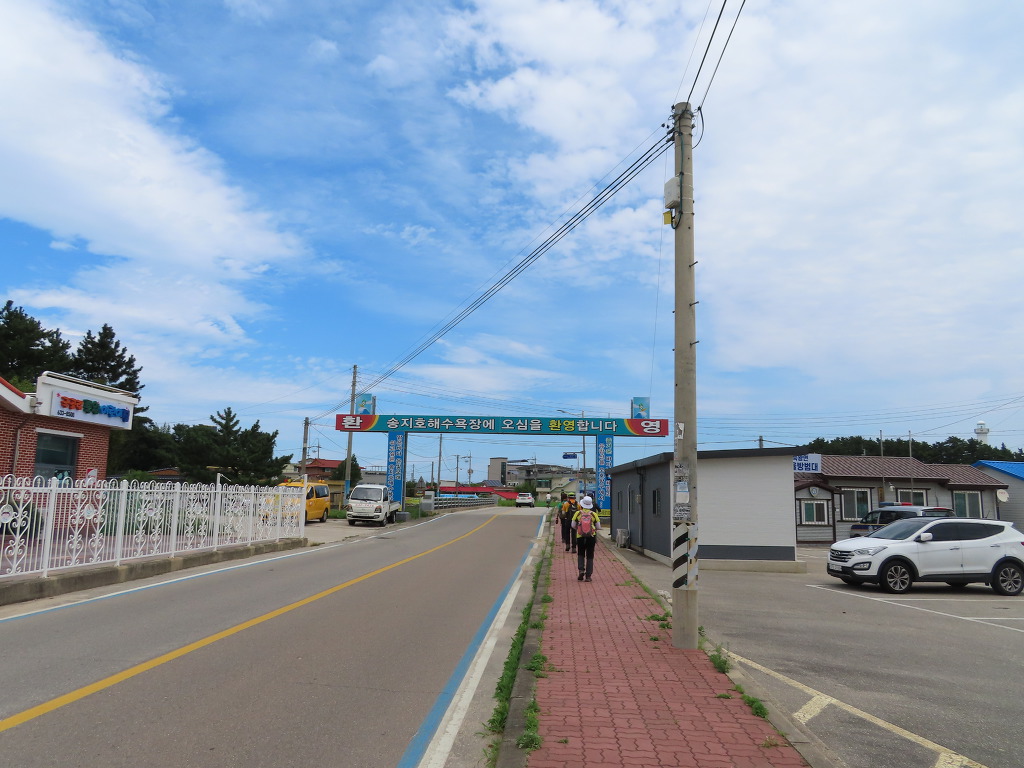 ▼ '오호항 어촌체험마을'과 '송지호 해변' 입간판이 세워진 '동해대로' 진출입로에서 우측으로 휘어져 죽왕 보건지소 앞을 지난다. 이어서 '송지호 해수욕장' 환영 아치를 통과하면 '오호교' 다리이다. 트레킹을 시작한지 20분만이다.