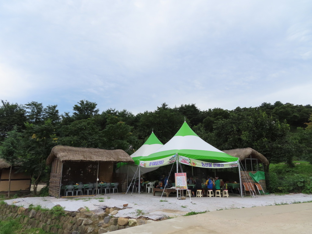 ▼ 조금 더 들어가자 왕곡마을(오봉 1리)의 마을회관(경로당)이 나온다. 특이 사항이 없기에 그냥 지나치려는데 ‘마을장터’에서 흘러나오는 구수한 냄새가 후각을 자극시키는 게 아닌가. 농산물 판매점인줄 알았는데 요깃거리까지 팔고 있는 모양이다. 아니 메뉴판은 아예 주막집을 연상시키고 있었다. 조금 전 발걸음을 이끌었던 냄새는 막걸리와 궁합을 맞추기 위해 지져대는 메밀전에서 흘러나왔던 모양이고 말이다.
