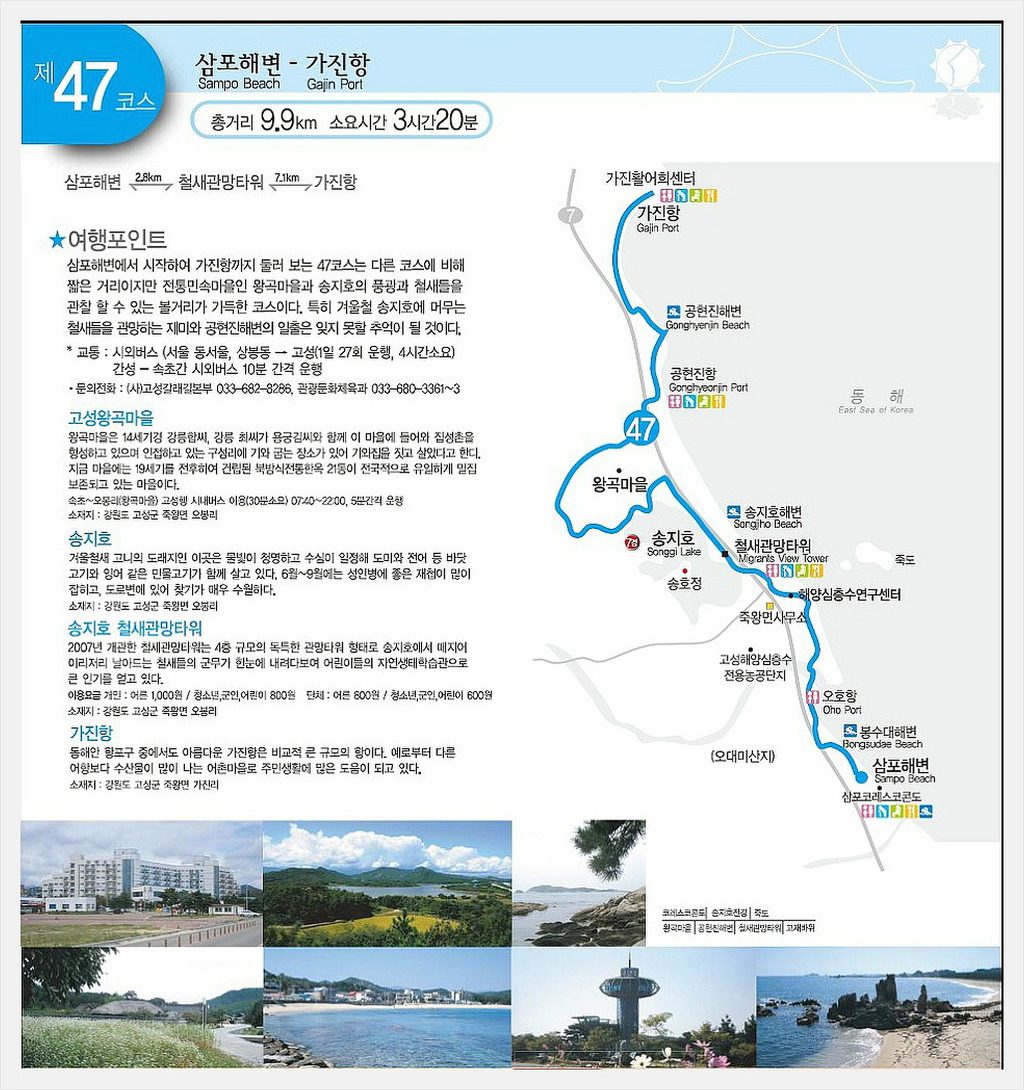 여행코스 : 삼포해변(3.2km)→봉수대해변→송지호 철새 관망타워(2.4km)→왕곡 한옥마을(4.1km)→공현진1·2리 해변→가진항(거리/시간 : 9.7km/ 실제는 11.51㎞를 3시간 15분)