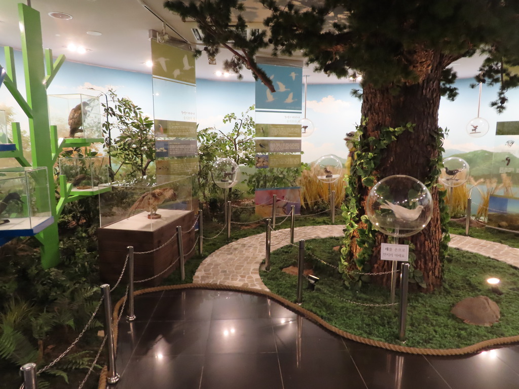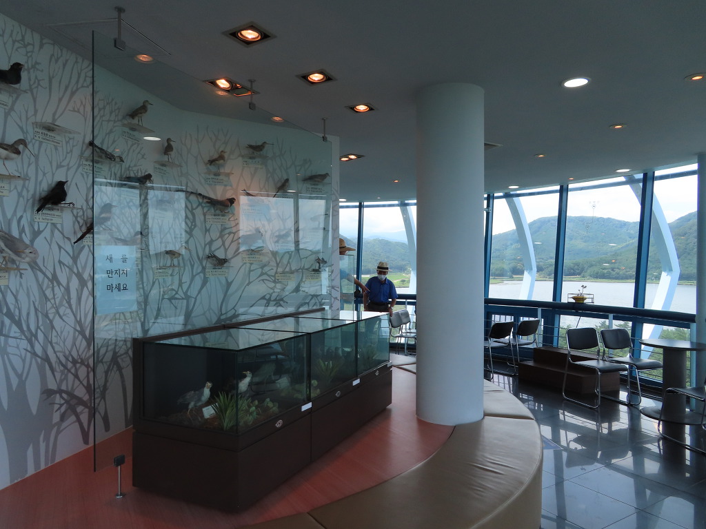▼ 내려올 때는 계단을 이용하기로 했다. 한 층 아래에 있는 야외 전망대(높이가 낮은 탓에 조망은 별로다)에 들렀다가 그 아래층에 있는 ‘조류박제전시관’을 들어가 봤다. 총 89종 240여 점의 새들이 박제되어 있단다. 그 가운데서도 철새를 소재로 한 우표들이 눈길을 끌었다. 참! 이왕에 시작했으니 송지호에 날아드는 철새에 대한 이야기도 해보자. 송지호를 찾아오는 철새들 중 대표적인 것은 괭이갈매기와 고니, 흰뺨검둥오리, 민물가마우지 등이다. 그 외에도 여름 철새와 겨울 철새, 나그네 새, 텃새 등으로 다양한데, 제철을 맞추어 송지호를 찾으면 철새들의 장관을 볼 수 있다고 한다.