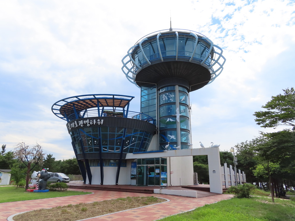 ▼ 그렇게 7~8분 정도를 걷자 `철새관망타워`가 나온다. 천연기념물 제201호인 고니와 괭이갈매기, 민물가마우지 등 송지호를 도래지로 삼고 있는 철새를 관찰할 수 있도록 만들어 놓은 지상 4층짜리 자연생태학습관이다. 호수의 고즈넉한 전경과 바다의 시원함을 동시에 내려다보는 즐거움은 또 다른 즐거움이라 하겠다. 면적 278.47㎡ 규모의 타워에는 총 89종 240여 점의 박제를 전시한 조류박제전시관과 송지호를 한눈에 조망할 수 있는 옥외전망대, 망원경이 설치된 전망타워 등을 갖추고 있다.