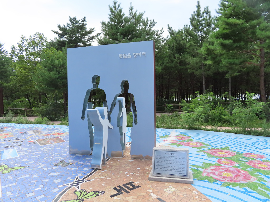 ▼ 관망타워에 올라가기 전 공원처럼 조성되어 있는 송지호 쉼터를 둘러보았다. DMZ의 고장 고성답게 평화와 통일을 염원하는 조각과 그림들이 전시되어 있었는데, 그 가운데서도 ‘통일을 향하여’라는 조형물이 가장 눈길을 끌었다. 남고성과 북고성으로 나뉜 고성군은 늘 가슴 아픈 분단의 역사와 그리움으로 표현되는 상처를 간직한 곳이다. 이 작품은 그런 지역적 특성을 고려한 것으로 한반도의 평화와 통일 대한민국에 대한 염원을 담았다고 한다. 통일의 문을 형상화한 높이 2.7m, 가로 2.2m의 사각 프레임 안에는 우리민족의 평화통일 염원을 상징하는 손을 마주잡은 인물을 음각으로 극대화시켰고, 앞뒤에는 소망과 화합을 상징하는 소년 소녀상을 양각으로 조형했다. 청색과 적색은 남북을 의미한단다. 참! 근처에 있다는 철새관망대는 찾아보지 못했다. 조형물 옆의 쉼터에서 일행들과 함께 술을 마시느라 들러본다는 걸 깜빡 잊었기 때문이다. 호수 위로 난 데크로드를 걸으며 이곳에 둥지를 튼 습지 생물들을 만나볼 수 있다는데 아쉬운 일이라 하겠다. 하지만 어쩌겠는가. 2주일에 한 번씩 만나는 동갑내기들이 권하는 술자리인데 어찌 마다할 수 있겠는가.