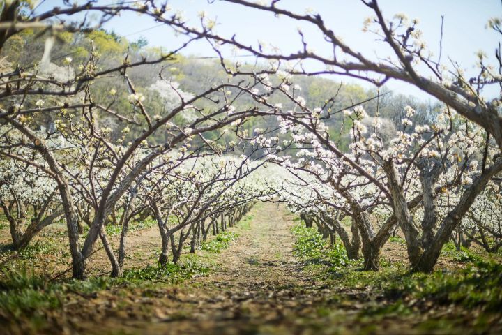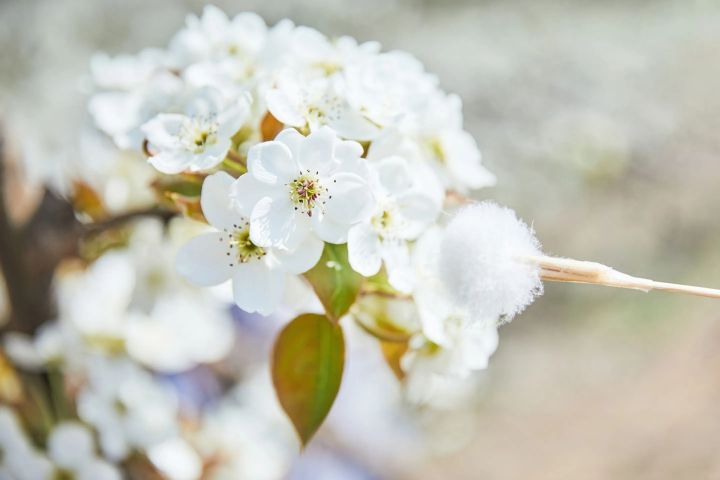 배나무는 4, 5월에 흰색으로 피며, 짧은 가지 끝에서 5-10개가 모여 납니다.