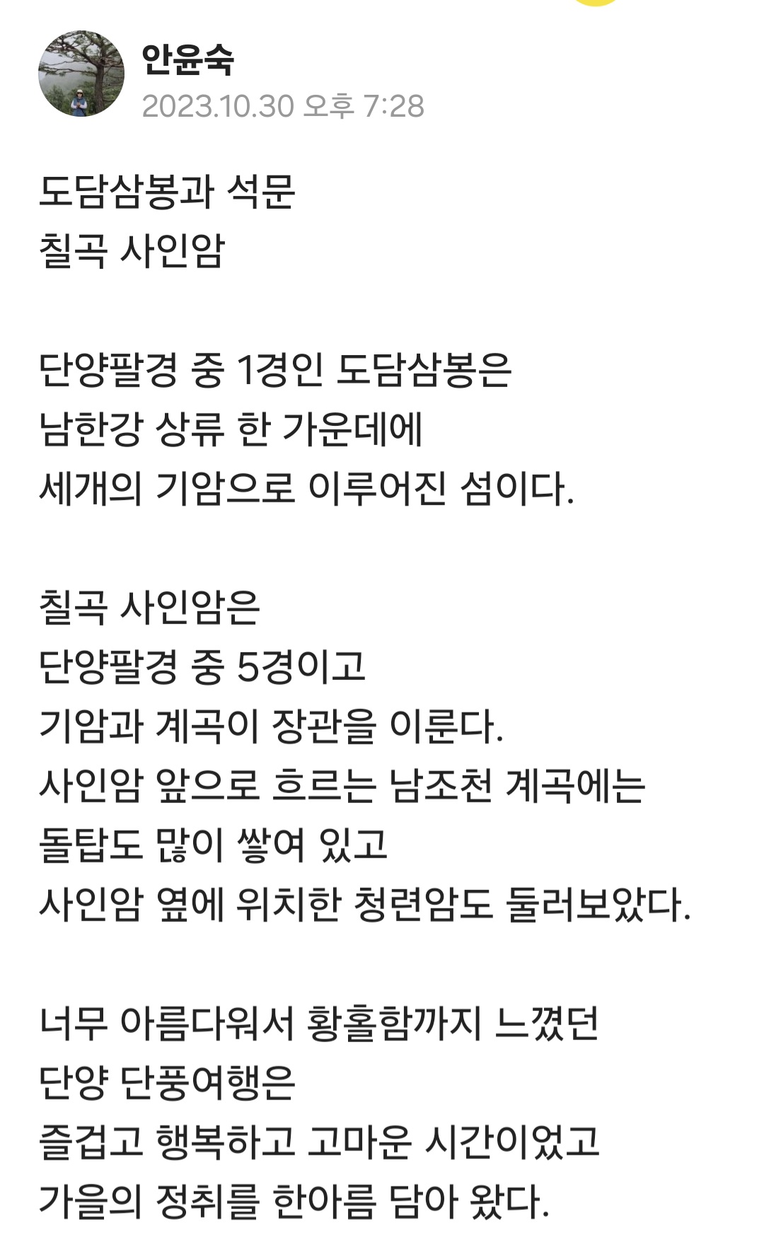 도담삼봉,석문,칠곡 사인암 작성자안윤숙|작성시간25.10.25|조회수8 목록 댓글 0 글자크기 작게가 글자크기 크게가 *사진은 카카오스토리에서 과거의 오늘이 올라와서 제 카스에 저장했던 사진입니다. 다음검색 현재 게시글 추가 기능 열기 북마크 공유하기 신고 센터로 신고 댓글 댓글 0 댓글쓰기 답글쓰기 댓글 리스트
