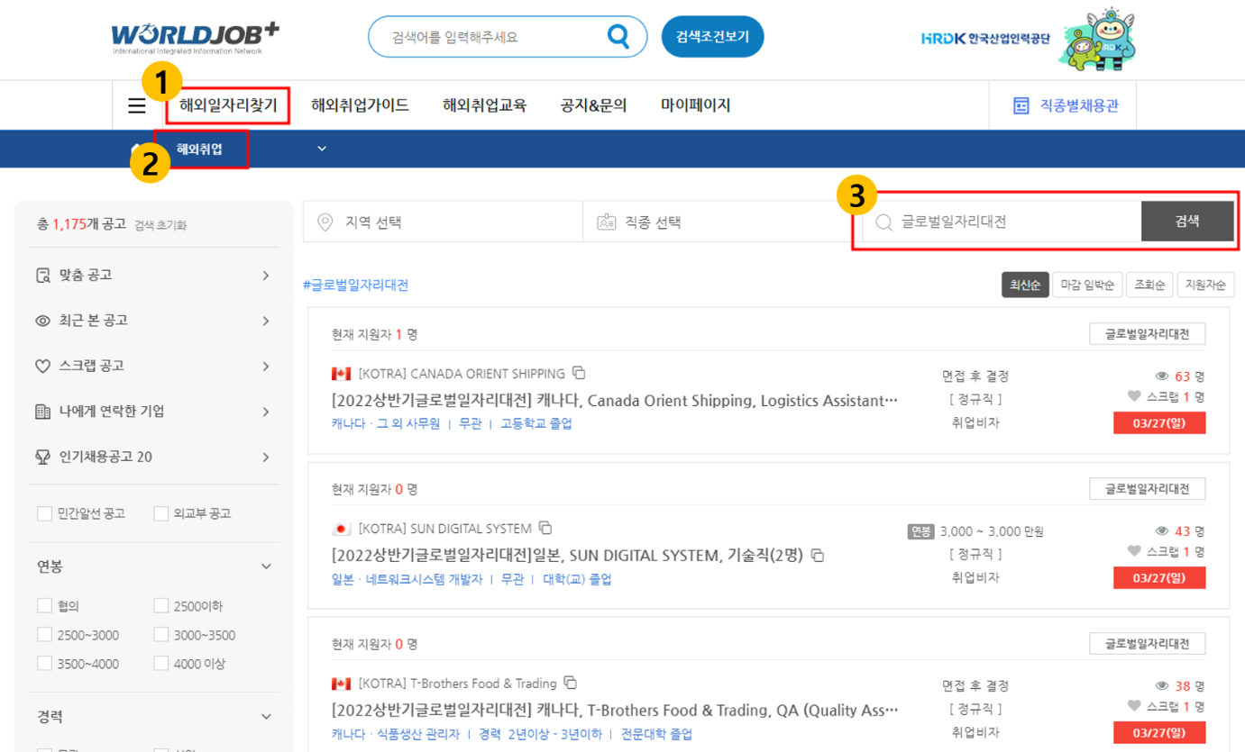STEP 2 ! 번호대로 해외일자리찾기-해외취업 Click하고, 글로벌일자리대전 Search!