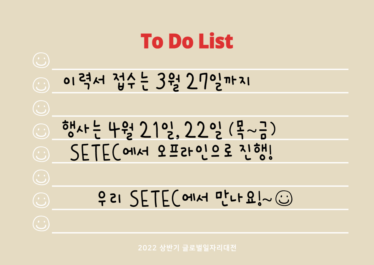 | 일시/장소 | 2022. 4. 21. (목) ~ 22. (금) / SETEC 제2전시장 화상면접 : 2022. 4. 21. (목) ~ 27. (수) / 행사장 또는 자택(Zoom) |
