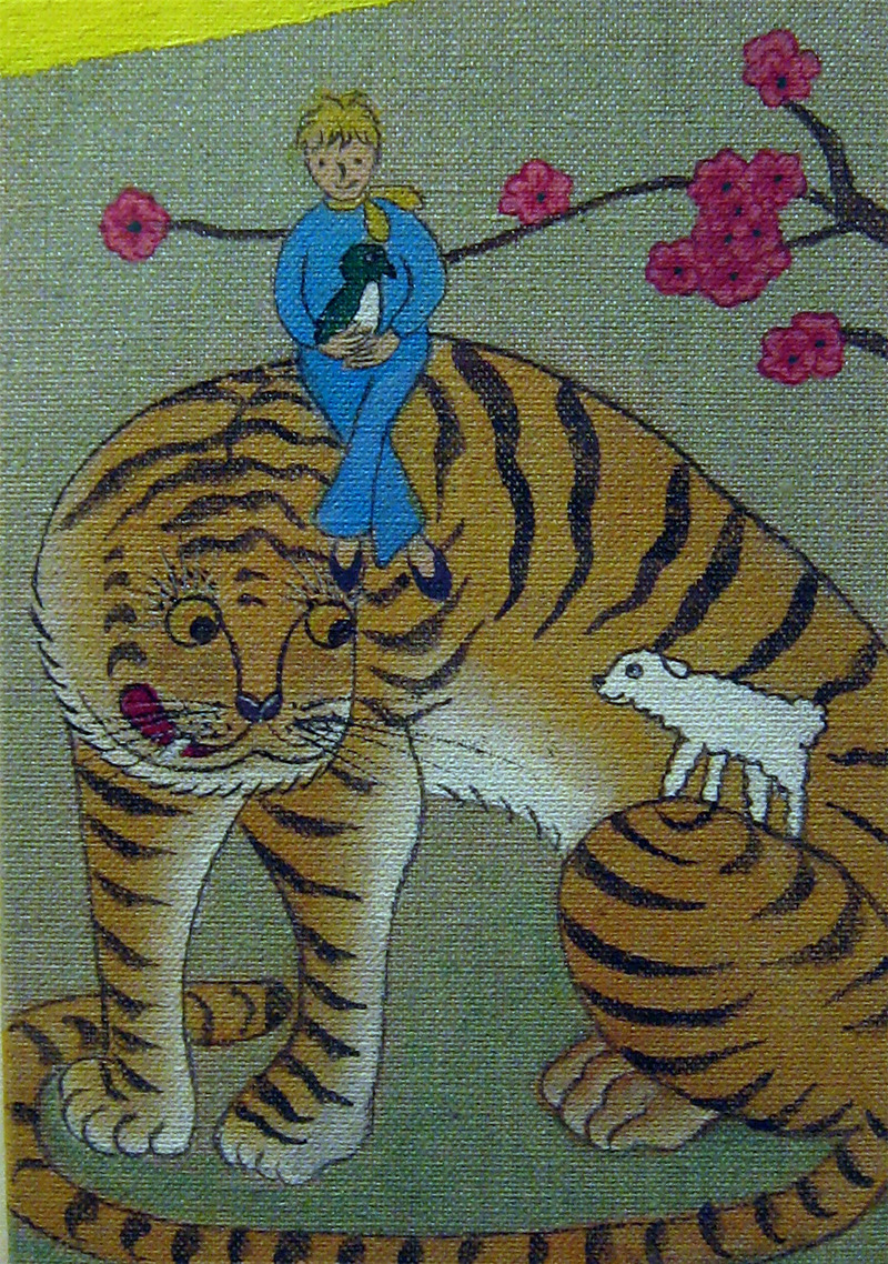 어린왕자가 우리나라 호랑이와 놀고 있고 아래쪽에는 어린왕자 친구인 양도 보입니다.