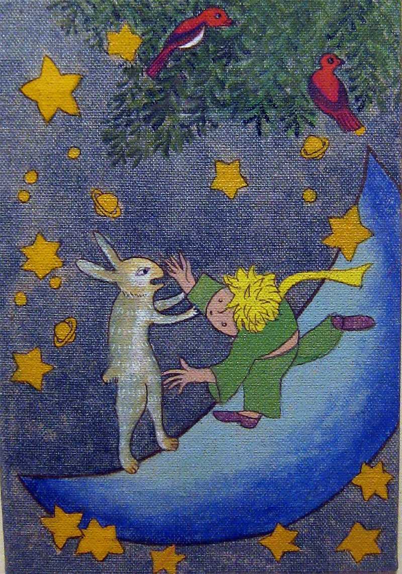 어린왕자가 우리나라 전래동화에서 달나라에 살고 있는 토끼와 만나고 있습니다.