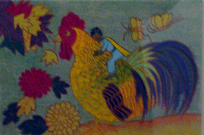 어린왕자가 우리나라 닭등에 매달려 놀고 있는데, 어린왕자의 얼굴색이 검습니다.