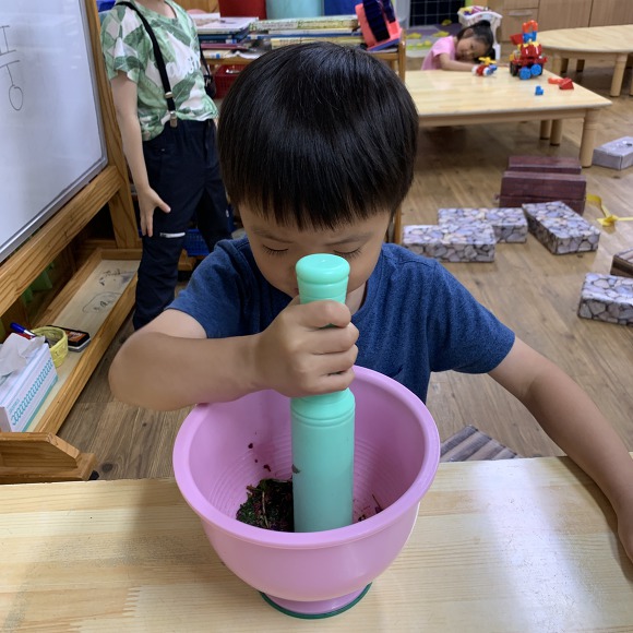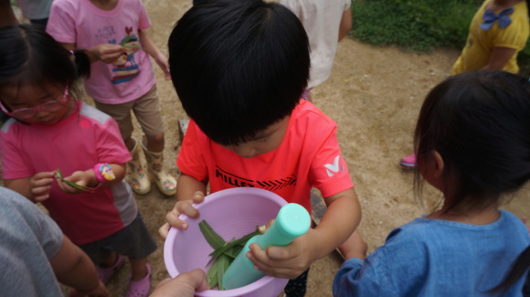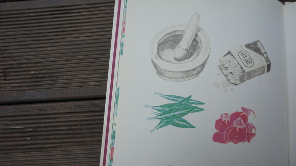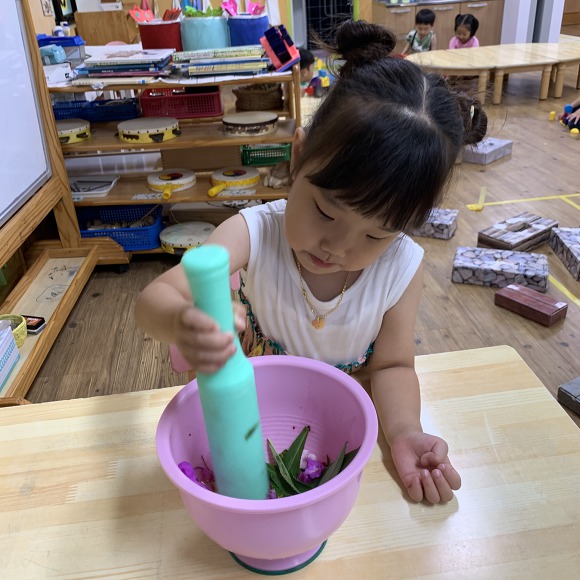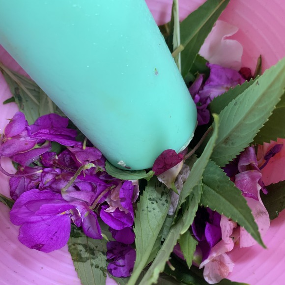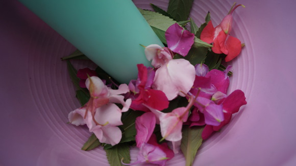 절구 안에 명반과 봉숭아 잎, 꽃을 넣고