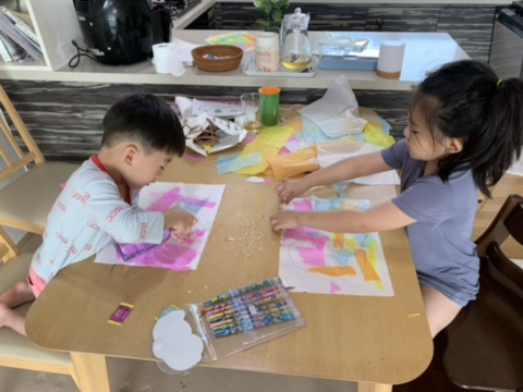 동생이랑 예쁜 색깔의한지들로 꾸미기놀이도 했답니다. 아직까지도 아이들이 열심히한 흔적이 식탁에 고스란히 베어 있기도 해요^^;