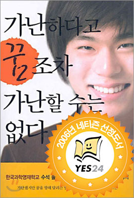 이 책을 yes24에서 처음 본 건 아마 5월의 어느 날이었을 것이다. 그 날도 여김 없이 무슨 책들이 있나 구경하고 있었다. 그 때, ‘가난하다고 꿈조차 가난할 수는 없다’라는 제목의 책이 내 눈길을 사로잡았다. 제목만 보고도 평소 내가 즐겨 읽는 그런 종류의 책이라는 것을 알 수 있었다. 책 소개를 보니, 부산영재고를 수석으로 졸업하고 미국의 프린스턴 대학교에 합격한 남학생이 쓴 책이었다. 책 앞부분의 내용이 약간 실려 있어서 흥미가 들어 읽어 보았다. 저자가 초등학생 때 우연히 ‘7막 7장’이라는 책을 읽게 되고, 엄청난 충격과 감명을 받아 미국 유학을 결심하지만 매우 가난한 집안 사정으로 인해 꿈이 좌절되려는 찰나, 신이 도와준 듯이 그 해 부산영재고가 설립되며 학비가 전액 정부 지원이라는 말을 듣고 부산영재고 진학을 결심했다는 내용이었다. 나는 도대체 ‘7막 7장’이 어떤 책이길래 그렇게 엄청난 정신적 충격을 받게 되었을까 하는 호기심이 생겨 즉시 그 책을 검색해 보았다.