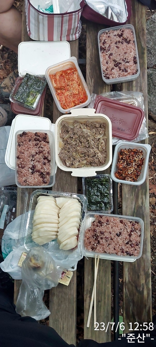 12시 58분 폭포소리 벗하며 맛난 점심을 합니다,