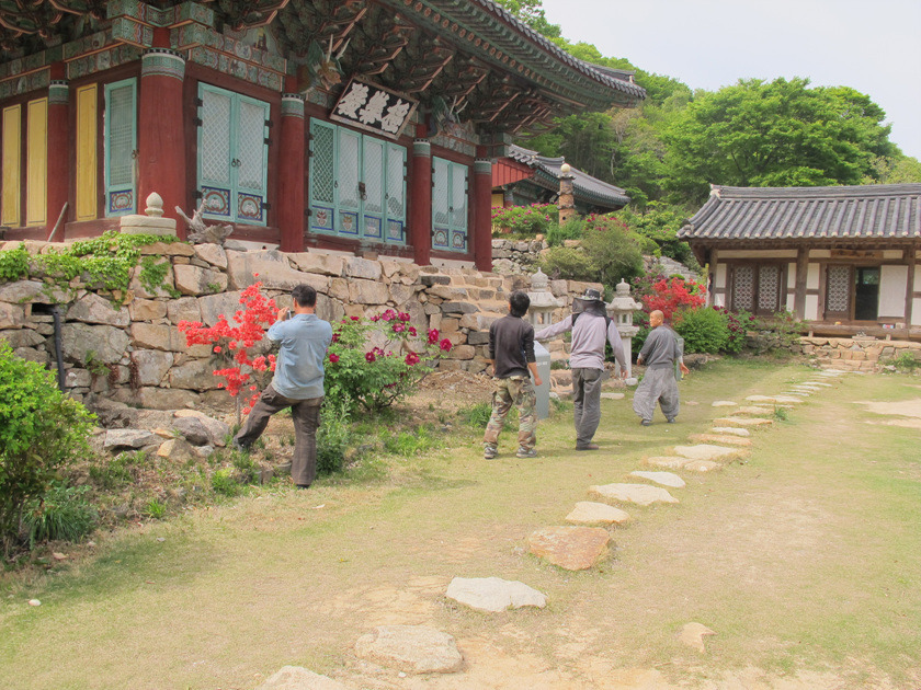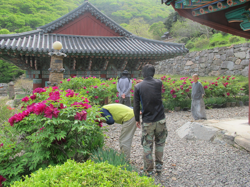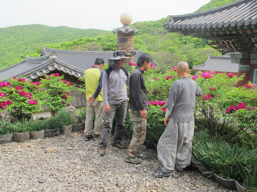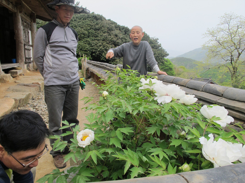 목수들이 오후 새참을 먹고 나자 스님께서 모란꽃밭으로 안내했습니다.