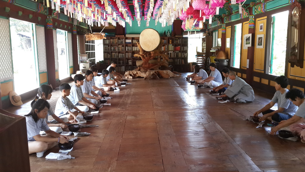 우리는 지금 발우공양 습의 중입니다. 공양의 참된의미와 음식의 소중함을 다시한번 마음으로 되새기며 한톨의 밥알도 헛되이 하지 않음을 되새겼습니다.