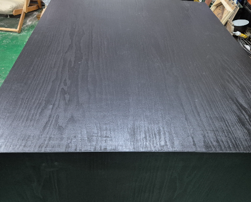 천연 무늬목 위에 블랙 도장으로 질감이 있는 마감입니다