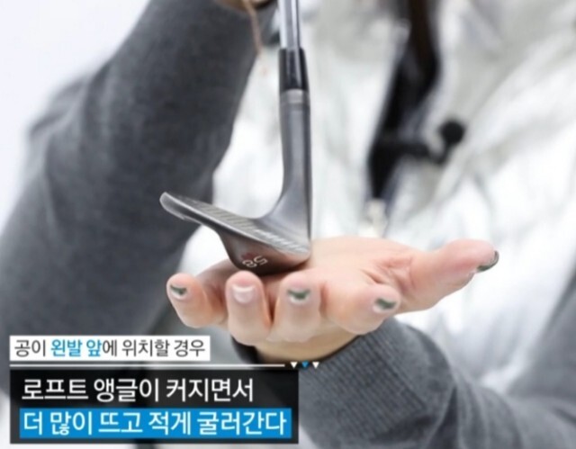 왼발에 가깝게 볼이 놓일수록 로프트 앵글이 커지며 더 많이 뜨고 적게 굴러간다.