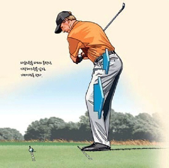 높은 의자의 가장자리에 앉아있는 듯한 느낌으로 동작을 취하면 효과적이다. 이를 연습하기 위해 의자 등받이를 엉덩이 끝에 대준 상대로 샷을 때려보자. 하체를 회전할 때 엉덩이가 계속 의자에 닿은 상태를 유지해야 한다. 그러면 전체적인 자세가 잘 유지돼 볼을 정확히 중심에 맞힐 수있다.