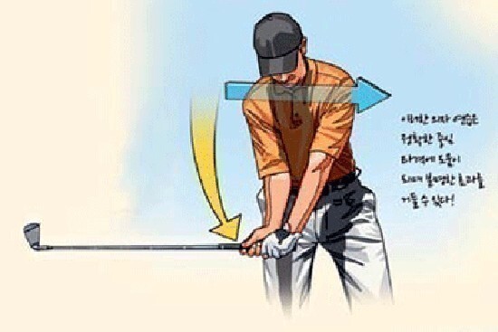 클럽을 자연스럽게 아래쪽으로 떨어뜨리지 않고 아래쪽으로 급하게 잡아당기면 오른어깨가 바깥으로 틀어지면서 가파른 아웃-인의 스윙궤도가 형성되고 만다.