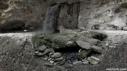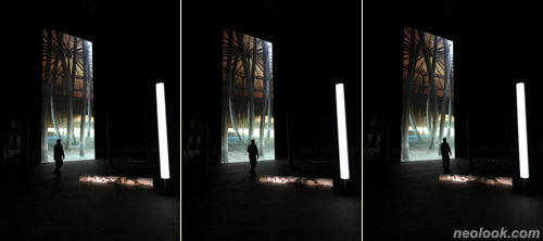 우선, '직사각형의 대형 레어-스크린'은 탱크 외부의 매봉산의 암반과 그 단층 그리고 탱크 외부를 둘러싸고 있는 인공의 콘크리트 벽면의 영상이미지를 통해 '탱크 외부를 탱크 내부공간으로 전이'시키고 있다. 동시에 이 공간의 시간의 흐름을 콜라주한 영상이미지와 사운드-탱크 내부에서 오일 떨어지는 소리, 탱크 내부를 지탱하는 기둥의 움직임 소리, 그리고 그 기둥을 두드리는 소리, 매봉산의 바람소리 등-의 비선형적인 결합은 공간의 축적된 시간의 흐름을 현재로 가져와 새로운 시간성을 생산한다. 이어서 '탱크 내부의 기둥(제작된)과 결합된 스크린'은 탱크 외부의 암벽 지층의 단면을 영상이미지로 투사함으로써 '탱크 외부를 탱크 내부 공간과 결합'시키고 있다. 실제 기둥과 결합된 또 다른 백색의 스크린은 현시간성의 빛을 비유하는 것으로 잘린 기둥의 영상이미지와 동시에 공존함으로써 시간성을 전복시킨다. 마지막으로, '탱크 내부의 콘크리트 벽면 스크린'은 탱크 외부의 나무와 내부 콘크리트 벽면의 빛과 그림자가 혼재된 영상이미지를 시각화하여 '탱크 외부와 탱크 내부 공간의 혼재'를 보여준다. 동시에 탱크를 둘러싼 외부와 내부의 혼재된 공간성에 빛과 그림자의 실시간 움직임을 통해 새로운 시간성을 발생시킨다. ● 더불어, 탱크 내부의 다섯 개의 기둥과 결합된 목소리-실제 이 공간을 경험한 사람들의 인터뷰 일부-사운드 설치작업은 마치 과거에 탱크를 경험한 개체들의 시간의 지층을 통과한 무형의 현존들처럼 기둥사이를 휘감아 돌아치는 새로운 언어적 감각들을 생산해 내고 있다. 결국 『다시 흐르는』의 스크린의 설치방식, 영상이미지, 사운드의 비선형적인 방식에 의한 비정합적인 관계의 생산은 기존의 공간성을 비틀고 변형시켜 이를 통해 다양한 감각과 감성을 산출함으로써 공간을 새로운 시간성의 차원으로 이끈다.