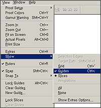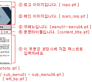 ② main.psd 파일을 열면 포토샵 menu의 view에서 show → guides를 켜도록 합니다. 그러면, 이미 그어져 있는 가이드선을 보실 수 있을 것입니다. 작업을 하실 때에는 되도록이면 작업하고자 하는 이미지의 정확한 사이즈에 맞춰 가이드선을 그어가며 작업하시는 것이 편리합니다. |