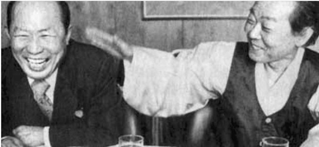 서정주(오른쪽)와 김동리가 생전 함께 웃는 모습. 이호철 ‘문단골 60년 이야기’ 중