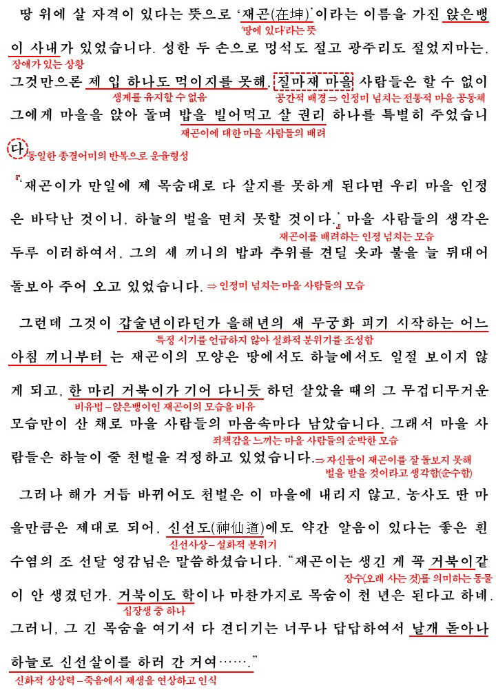 이 작품은 설화를 이야기하는 듯한 서사적 구성을 통해 시간의 흐림에 따라 시상을 전개하는데요. 읽으면 바로 알 수 있듯이 '재곤이'는 '신선'과는 상당히 거리가 먼 인물입니다. '재곤이'는 앉은뱅이(하반신 장애인을 낮잡아 이르는 말)로 두 손은 성해 명석도 절과 광주리도 절었지만 그 것만으로 생계를 유지할 수 없는 인물이었습니다. 그래서 질마재 마을 사람들은 할 수 없이 그에게 마을을 앉아 돌며 밥을 빌어먹고 살 권리 하나를 특별히 주었습니다. 얼핏 들으면 '특별히 주었습니다'에서 부정적인 느낌을 받을 수도 있지만 마을 사람들이 재곤이에게 밥을 얻어먹을 수 있게 해주는 배려임을 알 수 있습니다. 질마재 마을 사람들은 이렇듯 어려운 이웃을 도울 줄 아는 인정이 넘치는 사람들이었던 것이죠.