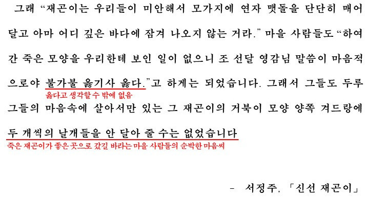 이렇게 마음이 무거웠지만 하늘의 벌은 내리지 않고 농사도 잘 되었고 흰 수염의 조 선달 염감의 말로 인식이 전환됩니다. 바로 재곤이가 거북이를 닮은 것에 빗대 긴 목습을 여기서 다 견디기는 답답해 날개 돋아 하늘로 신선살이를 하러 갔다는 말에. 마을 사람들은 동조하기 시작하고 마을 사람들은 긍정적 인식을 가지며 재곤이의 죽음을 '신선살이'를 간 것으로 여기게 됩니다. 이렇게 죽음을 재생과 부활로 인식하며 이 시는 마무리됩니다.